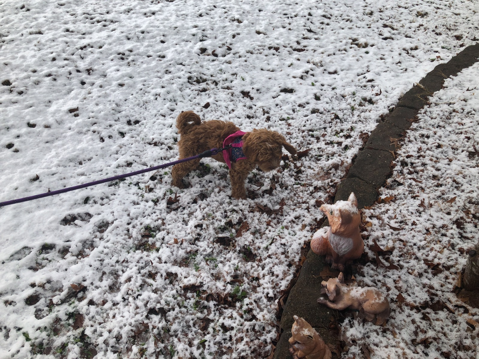 She seemed more interested in finding a leaf to nibble on and had some fascination with the foxes guarding the entrance than the 1″ or so of snow that didn’t even last until noon.